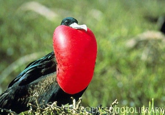 طائر بحري مميز بلونه الأسود و الكيس أو الحويصلة الحمراء الغريبة التي تتدلى من عنقه: