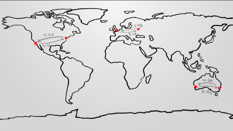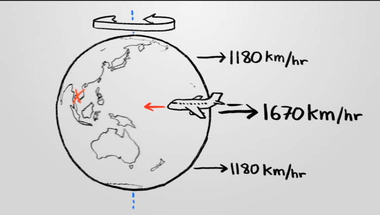 فبينما تدور الأرض نفسها بسرعة 1180 كم/سا إلى الشرق، فإن سطح الأرض نفسه وكل ما عليه يسافرون بسرعة أكبر حتى 1670 كم/سا! حتى الهواء فوق الأرض يسافر بهذه السرعة تقريبًا باتجاه الشرق. لذا، كي تنتقل أي طائرة إلى أي مكان، فإنه يتوجب عليها السفر بسرعة تتناسب مع سرعة الأرض من تحتها.
