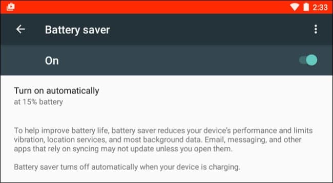 اذهب إلى الإعدادات ثم إلى البطارية واضغط على القائمة ثم على موفر البطارية Battery Saver، اسحب زر تفعيل موفر البطارية ليصبح الشريطين الموجودين في أعلى الشاشة وأسفلها باللون الأحمر للدلالة أنّ وضع موفر البطارية مُفعّل.