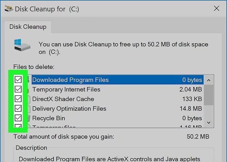 ضمن خيار"الملفات المطلوب حذفها" ستظهر قائمة بأنواع الملفات المسموح حذفها لتوفير مساحة حرة في القرص، حدد الملفات المرغوبة والموجود بجانب كل منها مقدار المساحة التي ستحصل عليها.