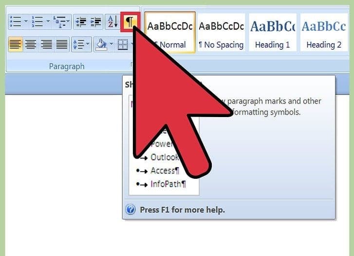 - اضغط على زر إظهار إخفاء، والموجود عادةً ضمن قسم الفقرة ويبدو على شكل حرف p معكوسة.