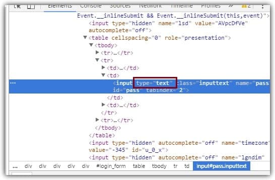 يمكن لأي مخترق عرض كلمات المرور المخفيّة على شكل نجوم (****)، إذا كان المتصفح قد حفظ بيانات تسجيل دخول فيسبوك. كل ما على المخترق القيام به هو إجراء بعض التغييرات من inspect element في متصفحك لإظهارها. لذلك، لا تترك جهاز الكمبيوتر مفتوحًا على صفحة التسجيل، يوصى بعدم حفظ بيانات تسجيل دخول إلى فيسبوك أو بيانات تسجيل الدخول لأي مواقع في متصفحك.