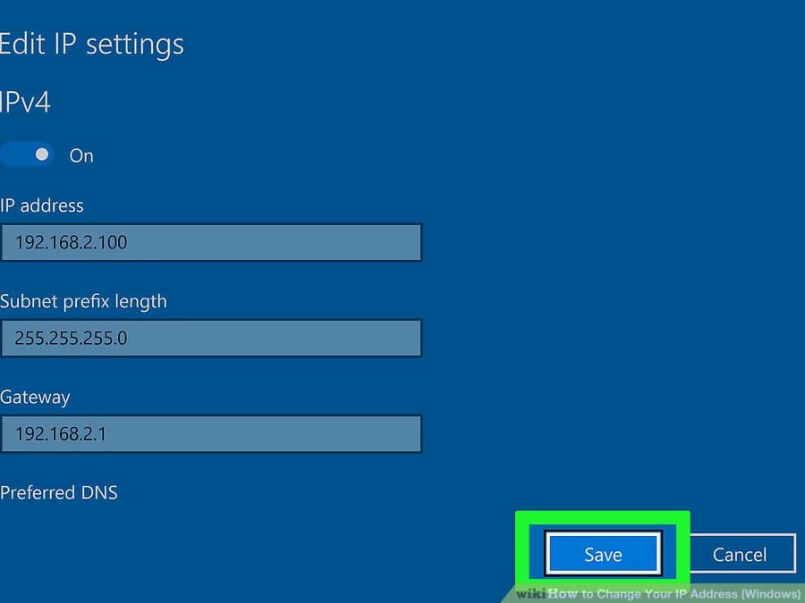 يجب كتابة عنوان IP جديد و طول بادئة الشبكة الفرعية و البوابة و خادم DNS المفضل و خادم DNS البديل ثم حفظ الإعدادات.